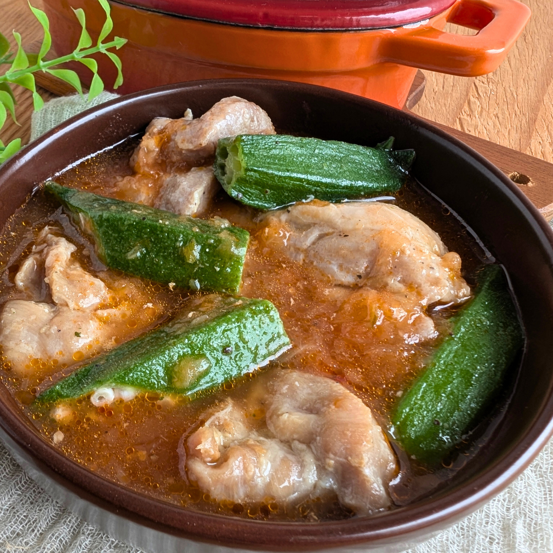 Skinless thigh, marinated in natural seasonings, and roasted until lightly browned, maintaining its succulence. It's finished in a rich broth of caramelized onion, garlic, tomato sauce, and okra, giving it a vibrant color and deep flavor. Unlike the traditionally fattier version, this version is lighter but still hearty.