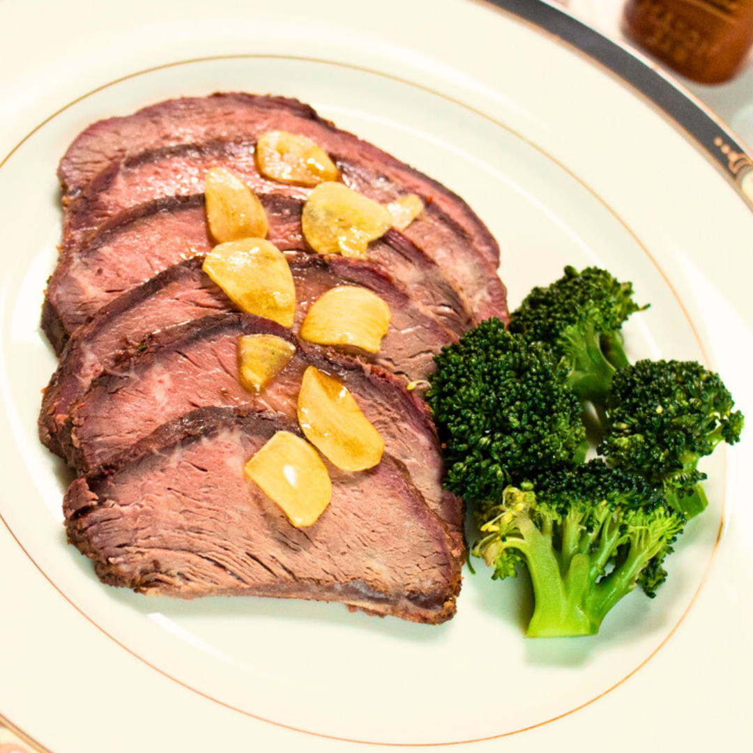 Nossa Picanha ao Alho é preparada com sal, pimenta-do-reino e alho, formando uma crosta aromática, assada lentamente e levemente defumada, garantindo sabor intenso por fora e maciez por dentro.